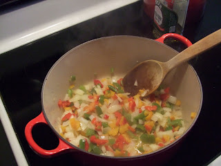Le Creuset stock pot) over medium heat, coat the bottom of the pan with a tablespoon or two of olive oil. Add the onions and sweat them. While they are cooking, open the package of peppers, drain the liquid (reserving it for later), and run your knife through the peppers on the cutting board a few times so they are in bite-size pieces. Add to the onions and cook for about 5 minutes, until the onions are no longer opaque.